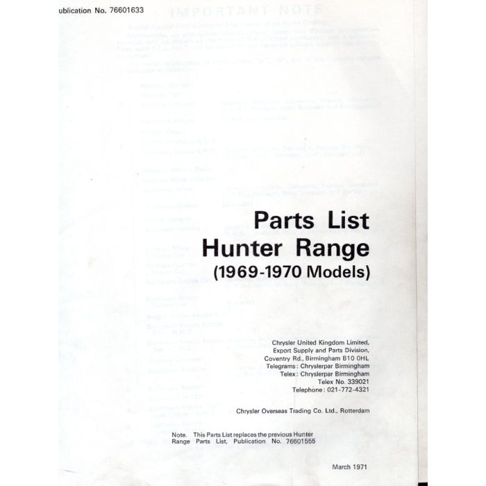 Chrysler Hunter Range (1969-1970) Parts List Publication NO.76601633